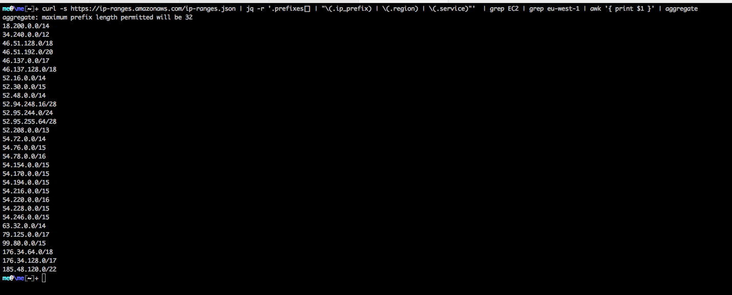 $ curl -s https://ip-ranges.amazonaws.com/ip-ranges.json | jq -r '.prefixes[] | "\(.ip_prefix) | \(.region) | \(.service)"' | grep EC2 | grep eu-west-1 | awk '{ print $1 }' | aggregate