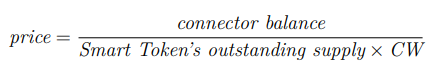 이렇게 발행을 위해 스마트 컨트랙트에 입금되는 예치금은 마치 우리가 아는 CRR(지급준비율)을 떠올리게 한다. 은행이 돈을 빌려줄 때에 일정량의 현금 또는 그에 준하는 자산을 보유해야 하는데 CRR은 그 비율을 뜻한다. 즉 CRR이 7%이고 전체 예금이 1000억이라면 93%, 즉 930억 원은 대출로 풀 수가 있다. 마찬가지로 스마트 토큰도 CW(connector weight)라는 개념을 제시하며 입금되는 돈, connector balance와 이로 인해 발행되는 토큰의 총 가치, price(token) X smart token supply의 비율을 정의한다. connector는 어떤 한 스마트 토큰에 연결된 스마트 컨트랙트를 뜻하며 connector balance는 거기 저장된 예치금을 뜻한다. 즉 CW에 준하여 입금되는 금액에 대해 스마트 토큰 하나의 가격을 계산하고 이를 발행한다.
