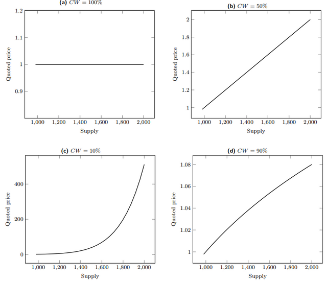 CW와 스마트 토큰 발행량(예치금 증가량)에 따른 가격 그래프이다. CW가 작을수록 가격이 급격하게 변하는 것을 볼 수 있다. 이는 뱅크런의 위험, 예치금이 적어지는 경우에 대한 방편이라고 생각해볼 수 있다.