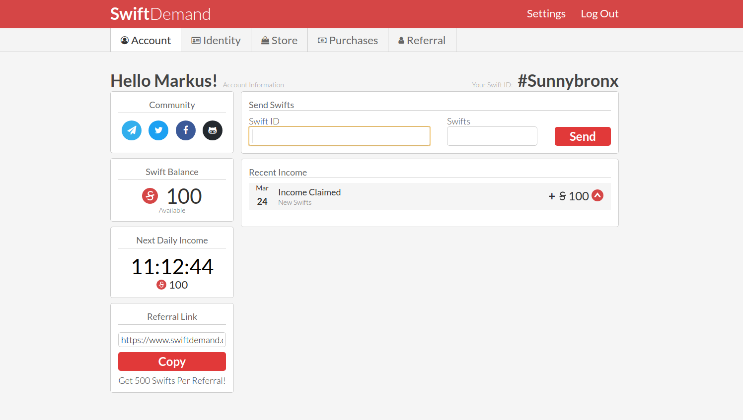 Swift Demand ist ein Experiment zur Sicherung einer Grundversorgung. Jedem angemeldetem Nutzer werden täglich 100 Coins zur Verfügung gestellt. Über ein Empfehlungssystem lassen sich weitere Coins generieren. Besucht Du die Homepage von SwiftDemand über diesen Link , werden in diesem Fall mir 500 Coins gut geschrieben. Jeder Benutzer bekommt seinen eigenen Referral Link, dieses Belohnungssystem existiert, bis die Plattform 500.000 Mitglieder erreicht hat.