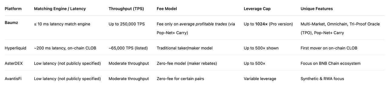 - Leverage & Mechanics: With up to 1024× leverage, Baumz sets a new standard for leverage in decentralized perpetuals, while others remain below 500×.