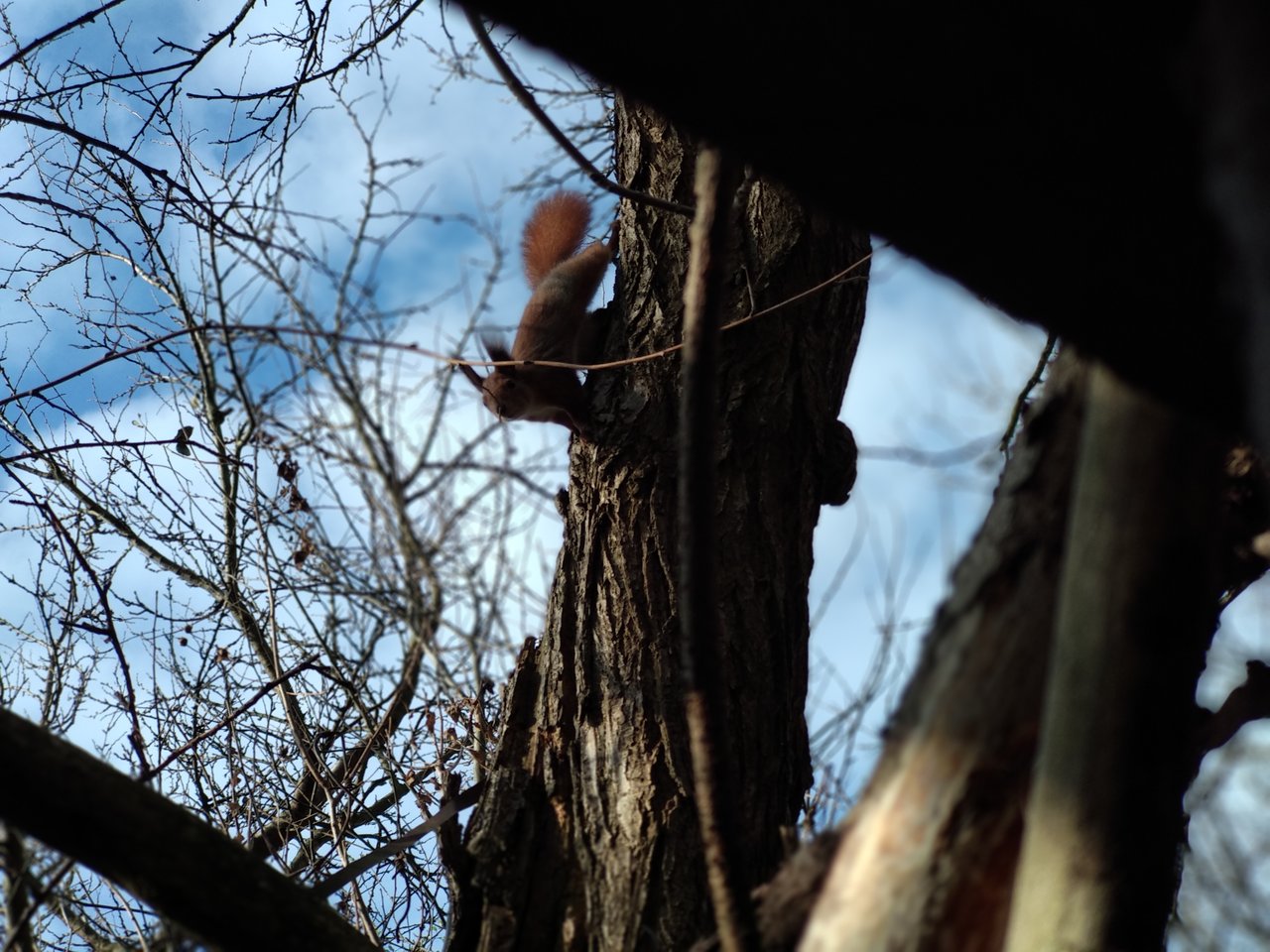 I went in my creative direction in my direction and turning out of the forest turned my head and I see squirrels climbing on a tree three meters from me.