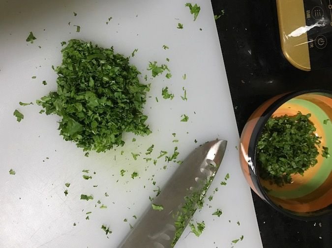 Chop the cilantro. Pinch it down with your fingers close to the knife.