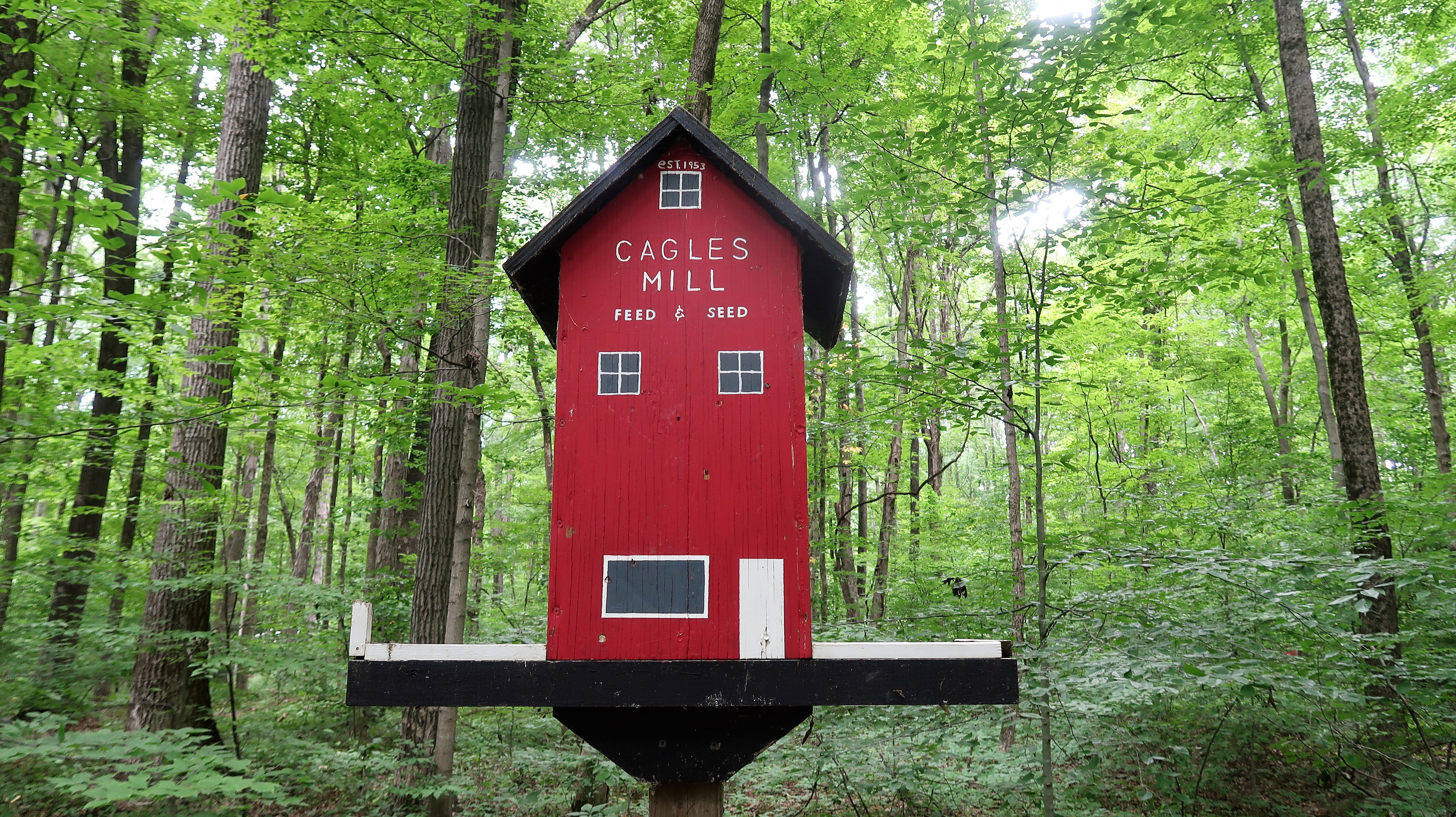 The first thing we did was walk the Covered Bridge Nature trail. It was not a very long trail but we enjoy it and getting to see this cute little bird feeder.