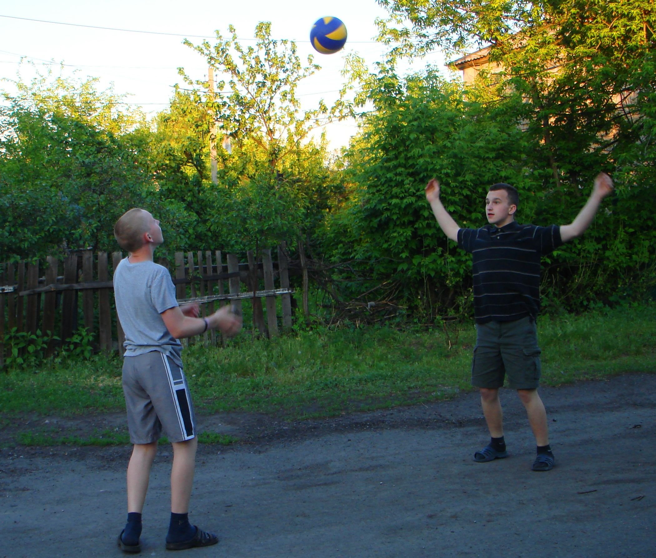 The boys Tolik, Vania, Elisey also played ball in the street near the old neighbor house.