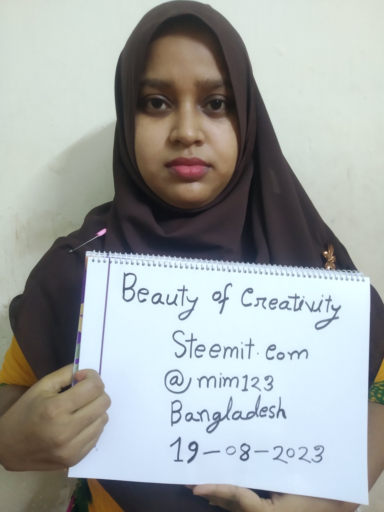 আসসালামু আলাইকুম সবাই কে। আমার নাম মিম। আমি ২৪ বছর বয়সী। আমার steemit ব্যবহারকারী আইডি নাম। @mim123. আমি লিখতে ভালোবাসি। আমি একজন ছাত্রী। আমি বাংলাদেশের রাজশাহীতে থাকি।