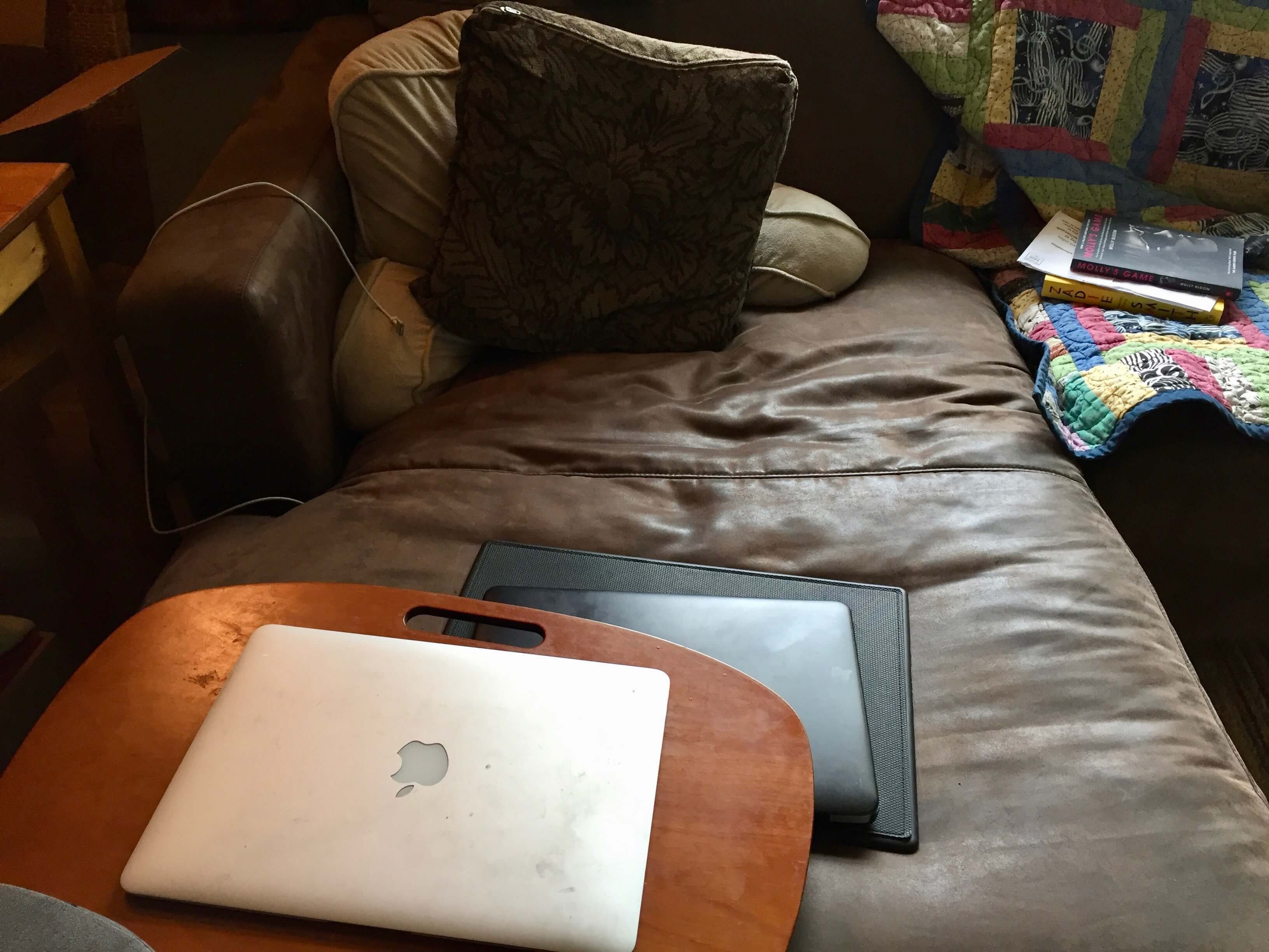 But in my spot, I have a little table close by with my coffee cup, my regular glasses, and a notepad. I also can stuff the pillow in my back and sit pretty straight which my back likes a lot. I started hanging out there once I got my laptop. Before, I was always working here.