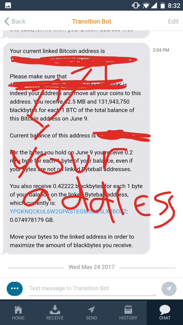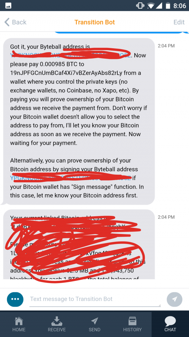 (Note: the crossed out red areas will be your byteball address. Also, the Bitcoin address to send to maybe be different.)