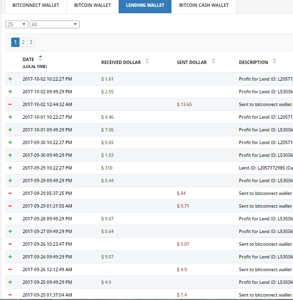 This is a screen shot of some of my returns over the past week. Green numbers are the daily returns received (save the $300 that was my re-invest) while red is me transferring it to bitconnect coin which I then turn in to BTC to cash out.