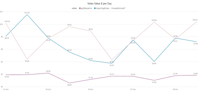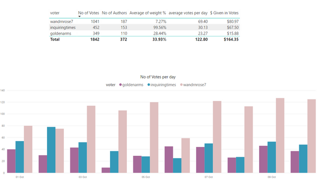 In fairness, each of these steemains were active voters before the delegation, however @wandrnrose7 was voting 62 times a day. 2.5 times that of @inquiringtimes. This ratio does not change much from post to pre with @wandrnrose7 killing it with 1041 votes since receiving all that power.