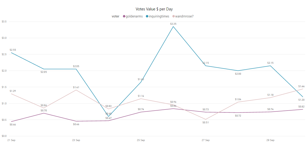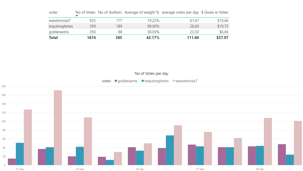 What also stands out from these two visualizations is the average % weight use in voting. Only @wandrnrose7 has reduced the weight per vote by a material amount.