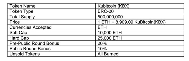KuBitX akan menerbitkan persediaan tetap sebesar 500.000.000 token KuBitcoin (KBX) yang didasarkan pada standar ERC-20. Alasan untuk memilih token ERC-20 adalah keakraban pasar saat ini dengan standar ini ditambah stabilitas Ethereum Blockchain.
