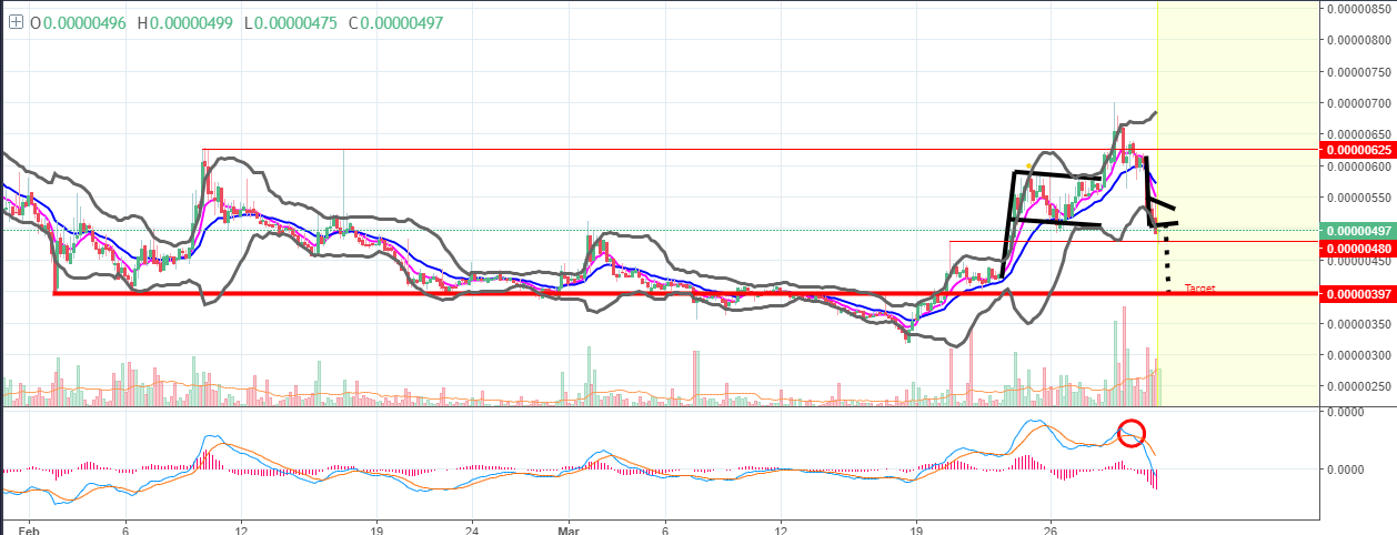 Welcome to this update a nalysis on TRON! Let's get it! Looking at the four hour chart, you can see that TRX/BTC -17.85% has rallied out of the bull flag , but it wasn't able to hold above the overhead resistance at 625. Now, Tron -6.06% has fallen dramatically, forming a bear flag consolidation, as the momentum expands to the downside. You can see that the MACD has just crossed below the zero line, which is a technical sell signal, while Tron -6.06% is printing a bear flag . Volume is declining, which confirms the consolidation inside of the flag. However, the majority of the recent volume has been overwhelmingly red. Furthermore, you can see that the big red reversal bar of 3/29 had very high sell volume associated with it. That's an indication of a major rejection of that level, so we can assume that further downside remains. Additionally, you can see that the candles inside of the flag body itself are very bearish — printing increasingly taller upper wicks. That's an indication of mounting sell-side pressure inside of the bear flag . With all of these negative indications, we can expect a breakdown of the bear flag to occur. Light support exists around 480, with major support around 397, where the downside target rests.*