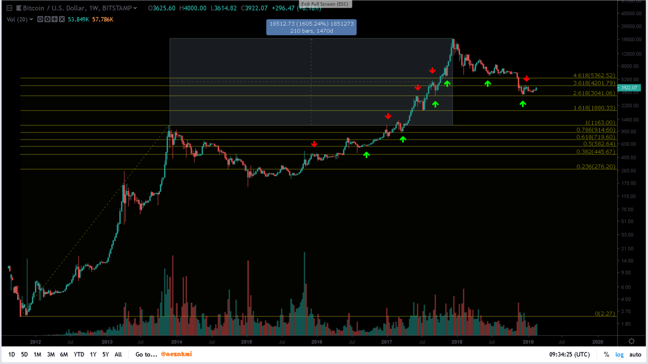 So, I took time to draw a Fibonacci retracement on the whole 2012 - 2014 move in order to see how these levels left their footprints on BTC's price action. As you can see, there are many times when we found support but also resistance at these levels. This whole peak to peak movement (2014 - 2018), happened with all the good, the bad and the ugly aspects in aprox. 1500 days (~4 years), with the price increasing from one peak to the other by 1600%.