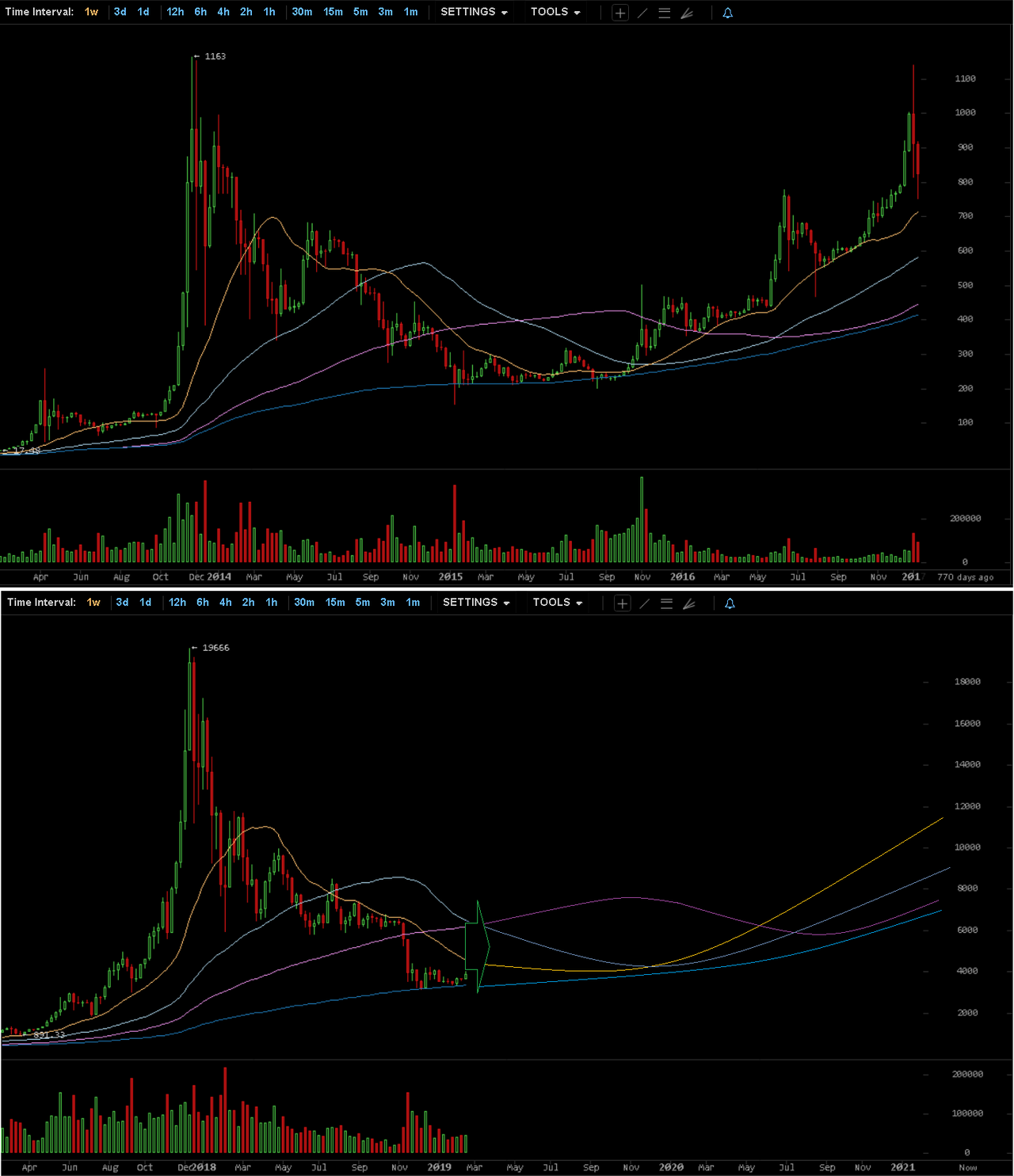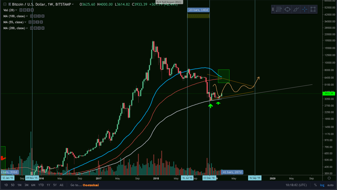 - The first image indicates four main MA's (unfortunately I couldn't change their color to what I usually use) and how they affect the price. As we can see, we never closed candles below the 200 week MA (dark blue this time) and as soon as the 55 (blue) came close to the 200 and bounced off, the bullish trend begun. In this new bullish run we were riding along the 21w MA (yellow).