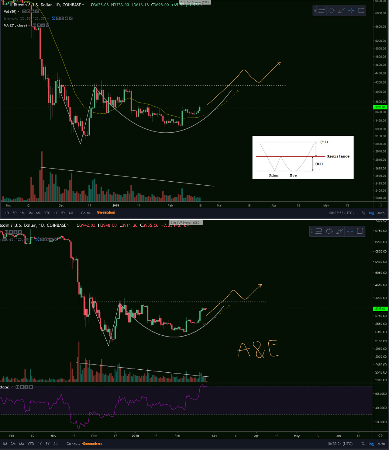 The first image is from 5 days ago, when I mentioned this Adam and Eve continuation. It turned out to be true. Let's see if we can break that resistance at 4100$. However, we have some flat tops there and the RSI is also unusually high for this times, so a brief correction to 3800 could happen.