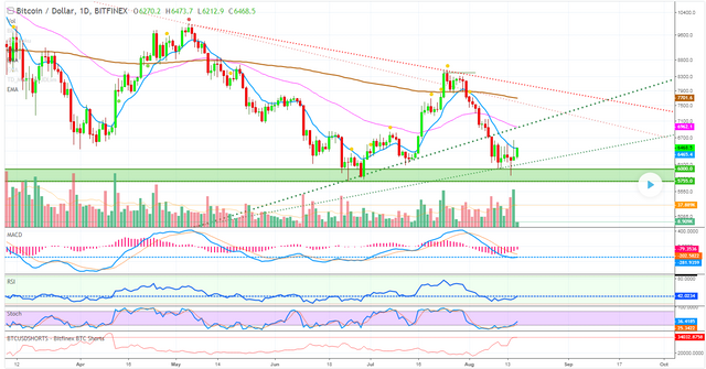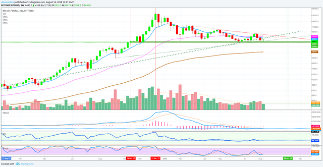 A crash like retrace is good because you know it can't go on for that long and weak hands are removed quickly. On top of that, we created a "higher low" when hitting $5858 on the 14th August compared to $5755 on 24th June. Several signals are telling us that this might be the bottom of our retrace and that another wave up is about to start.