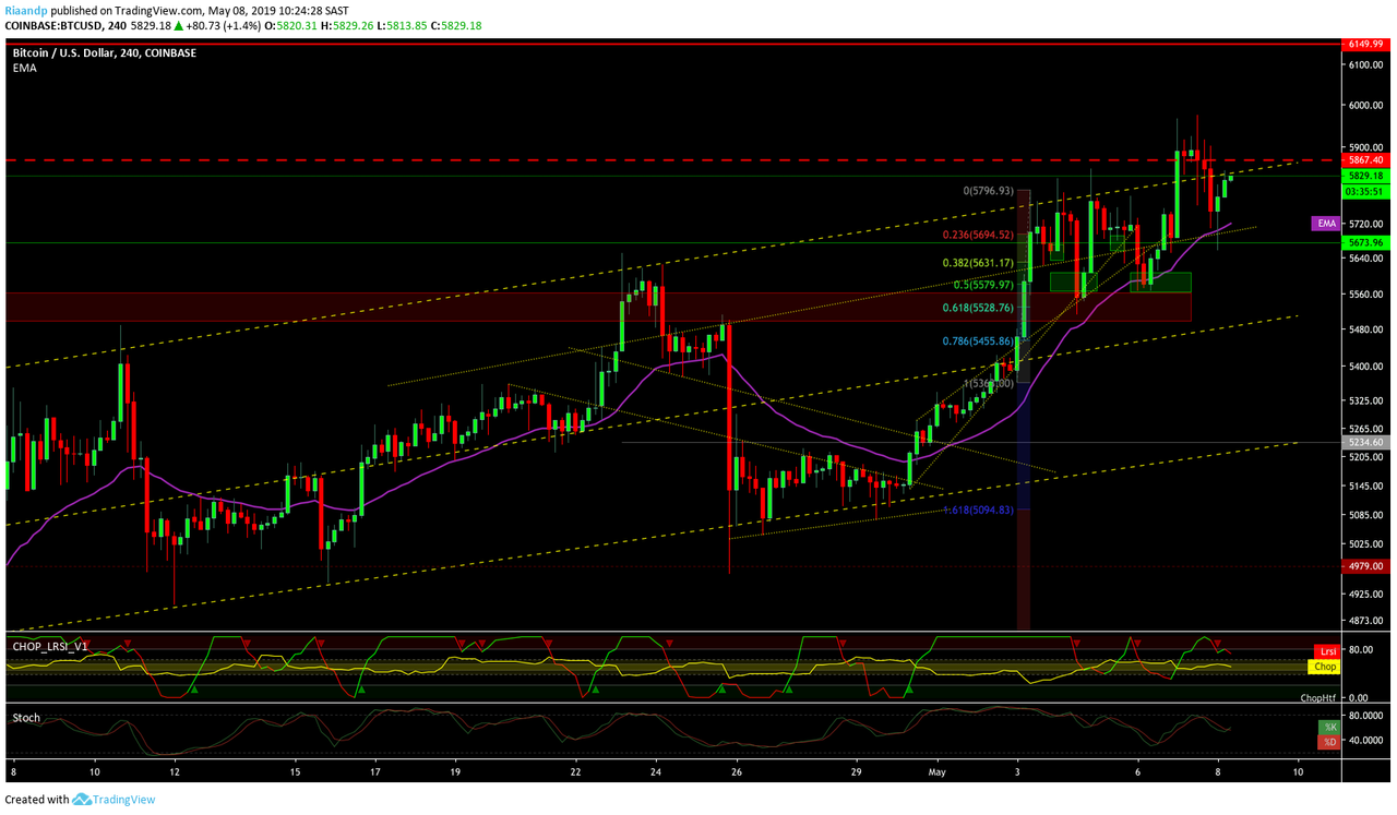 Bitcoin looked strong yesterday, but couldn't manage the S/R flip on $5867. Support was found on the top trend line for the lower time frame (1H) channel. Price is currently attempting a retest of the top trend line on the 4H channel.
