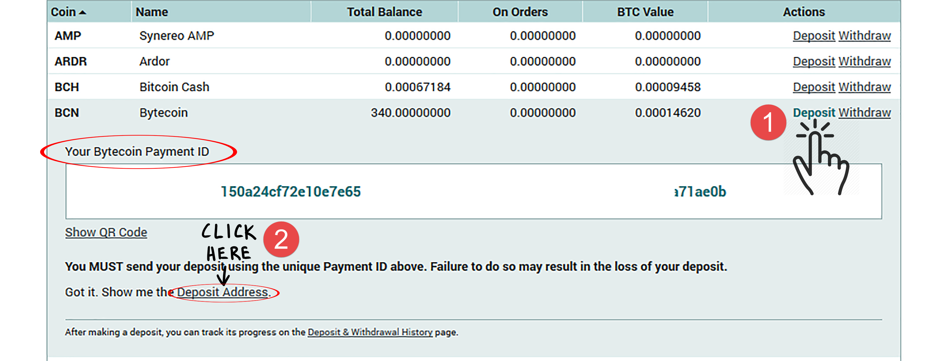 c/ Clicking on Deposit (1) will show up the Bytecoin Payment ID, you need also the BCN address, You can get that by clicking on showing me The deposit address ( 2).