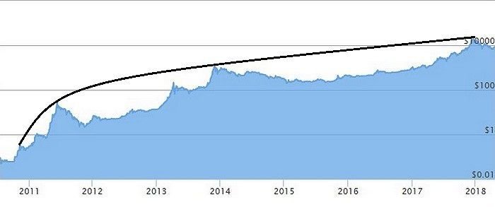 Here below is the same entire Bitcoin chart, this time on a logarithmic graph. It shows better all the bubbles from the beginning of BTC. As you can see, they are separated by different time intervals. The curve in this graph looks opposite to the linear one. The size of the bubble from 2011 appears here (then the largest percentage increase in price occurred) 👇