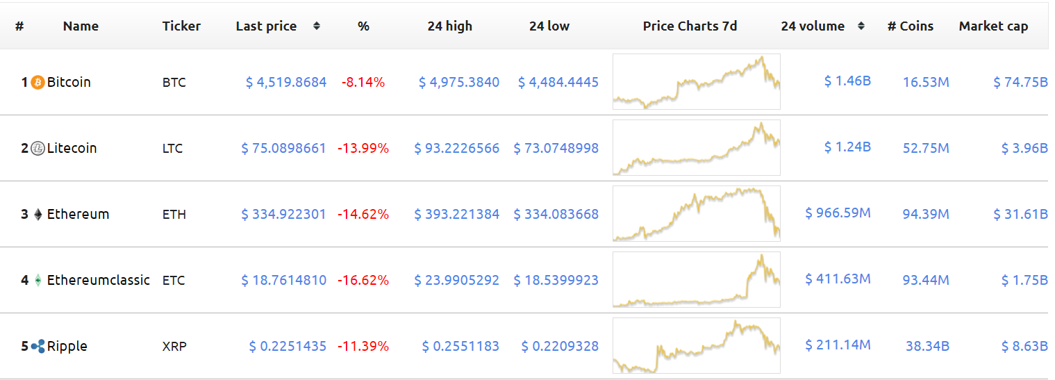 With the recent all-time high of around $5000 for one Bitcoin, some massive profit taking was triggered, resulting in a bloody Saturday for most crypto's.