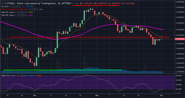 There is similar action in Steem. The downward move paused for the moment. However, we are still below the 2.5 resistance line. There is no volume. So seems like we are stuck here for the moment. Unless someone is willing to accumulate steem, there is little interest to trade it at these levels.