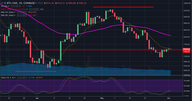 As of the writing, BTC is trading slightly above the 7400 resistance line, but there is no way I can say that it cleared the resistance. Volume is terribly low, and therefore there is no powerful movement in any direction. This is a traditional trading range and grinding action. For trading purposes I personally am staying out of the market until I see any directional bias.