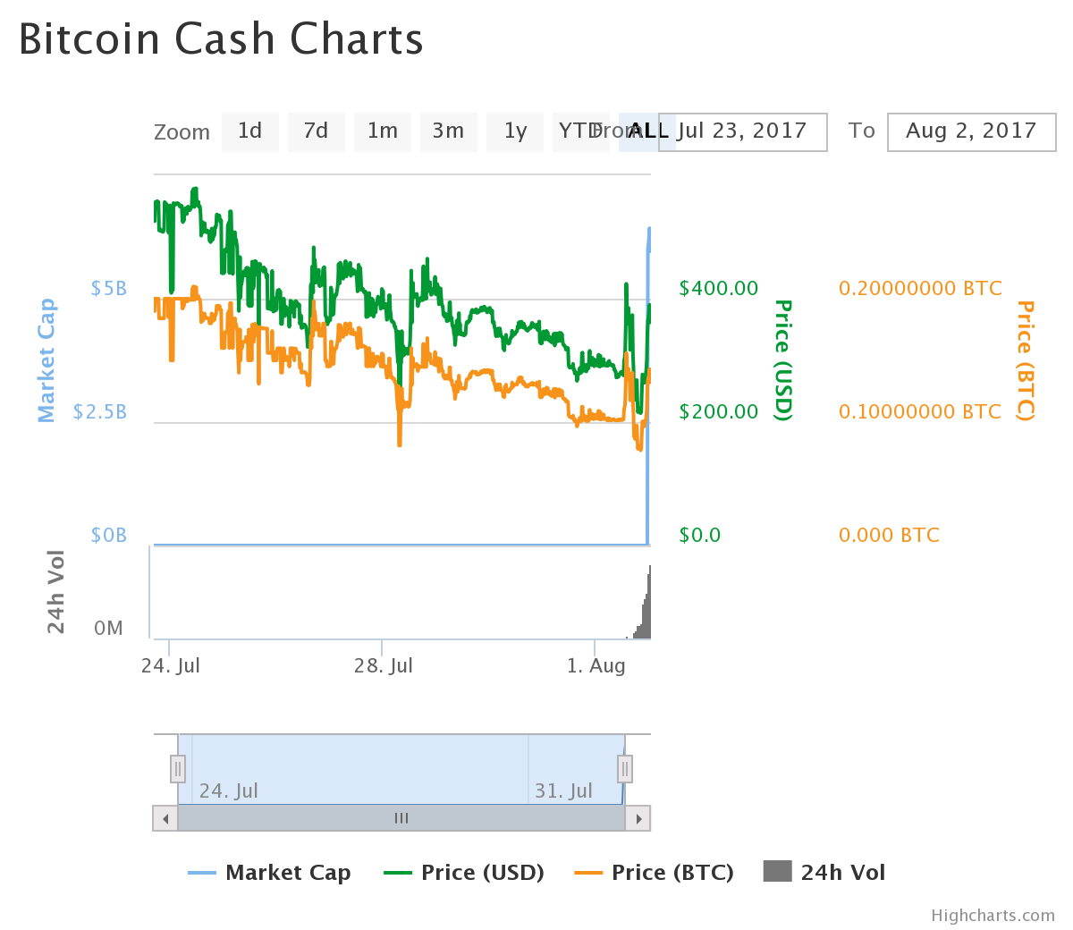 Historical Charts complete screenshot of the first day of the new Bitcoin Cash coin on day 1 " The Forkening" :