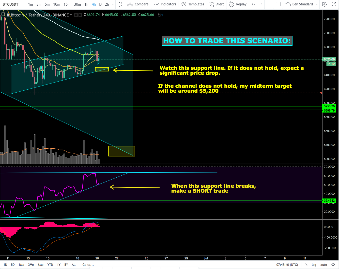 - RSI is resting on a support line that needs to hold. If not, $6,500 is next and then down to the support line of the bigger channel which is around $5000 area.