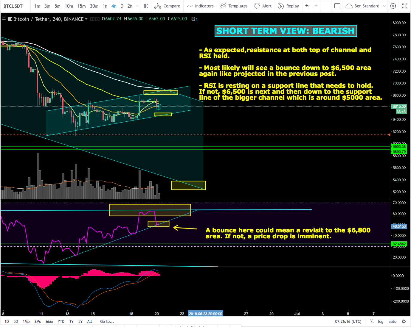 If you read my previous post, you can see that I anticipated a peak at $6,900 area and we almost hit that target. We're on the path down to $6,500 again as we failed to break RSI resistance.