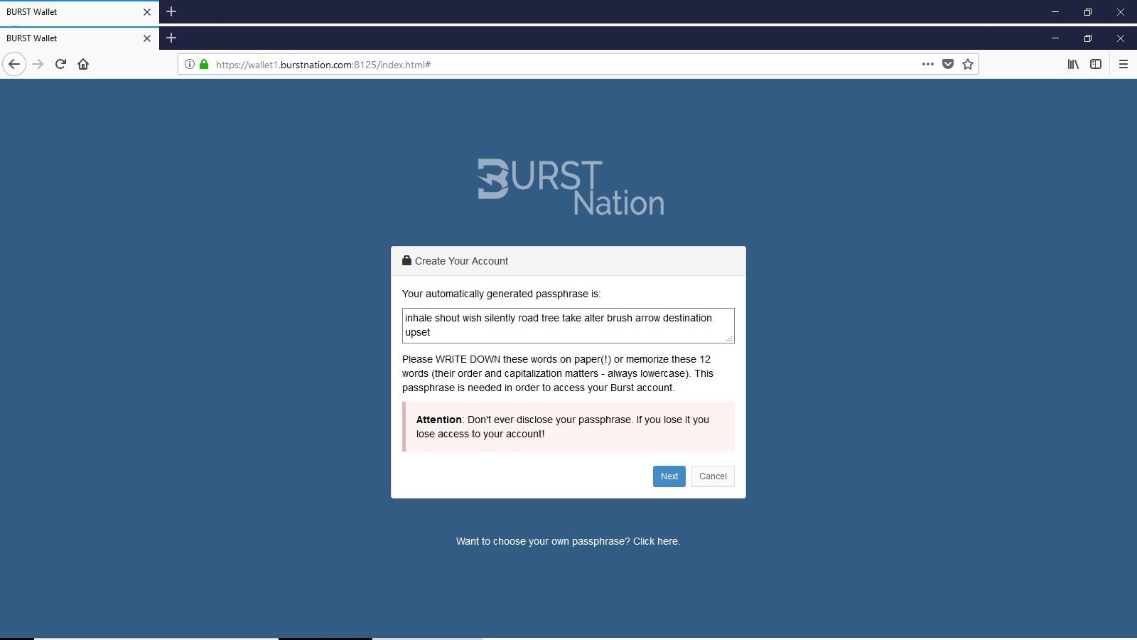 Please note, the address used in this post is a DUMMY ADDRESS, which is why the passphrase has not been removed from the screenshots. DO NOT SEND ANY BURST TO THIS ADDRESS, as anyone who has read this post will have access to the funds there, and we cannot and will not be held responsible for any funds transferred to this address