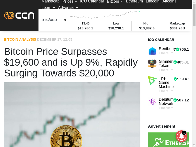 Bitcoin Price Surpasses $19,600 and is Up 9%, Surging to $20,000