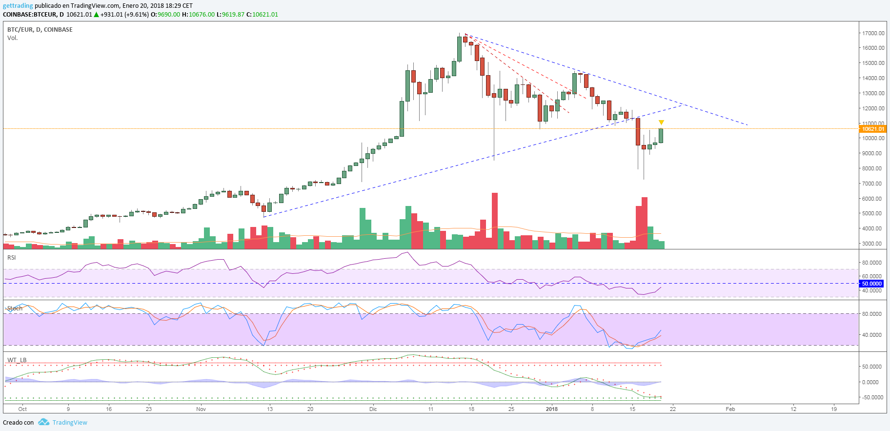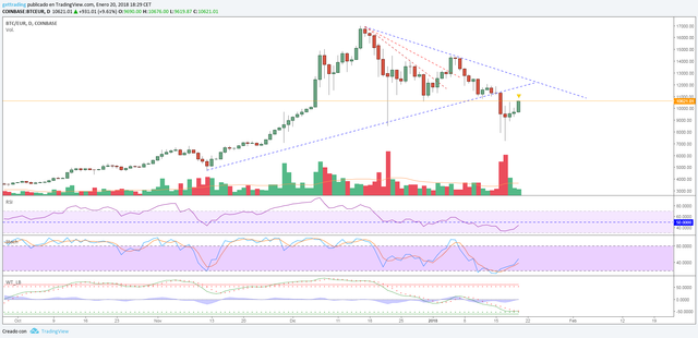 Si quieres tradear cryptos contra Bitcoin una de las cosas que debes tener controlada es en que momento se encuentra Bitcoin lo cual aunque parezca obvio se nos olvida, la forma más fácil es que lo primero que hagas es abrir gráfica diaria de bitcoin y trazar lineas de tendencias entre sus máximos y mínimos, si el precio se encuentra cerca de estos considerarlo zona de peligro, si se encuentra en zona intermedia tienes vía verde.
