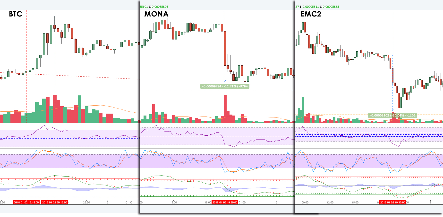En esta imagen vemos la sincronización de las gráficas desde que el bitcoin rompe zona de resistencia a las 18:15 el 2 de enero y las criptos reacionan en sentido inverso en el momento de la consolidación de la ruptura, sobre las 19:30 donde MONA y EMC2 por ejemplo, caen un 13%aprox. en muy pocos minutos.