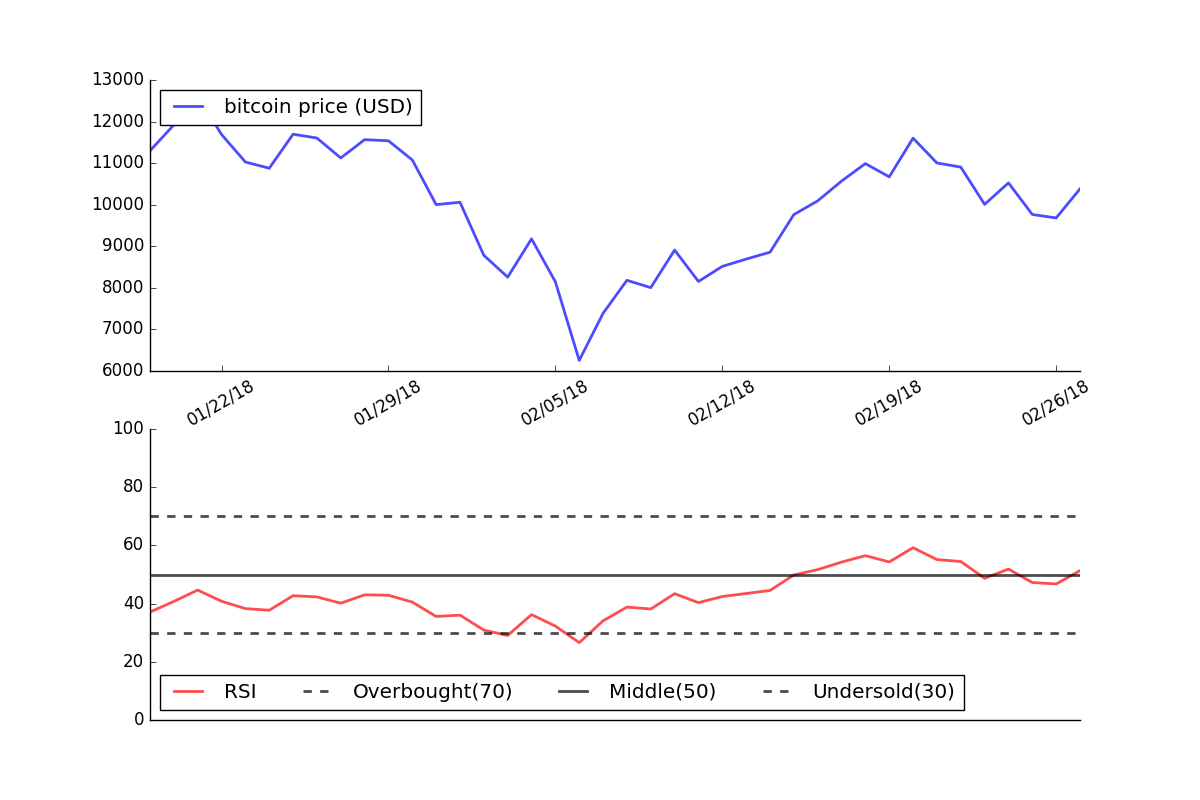 Since the RSI is currently between 30 and 70, this would indicate that Bitcoin is neither overbought or oversold and that no material price change is expected.