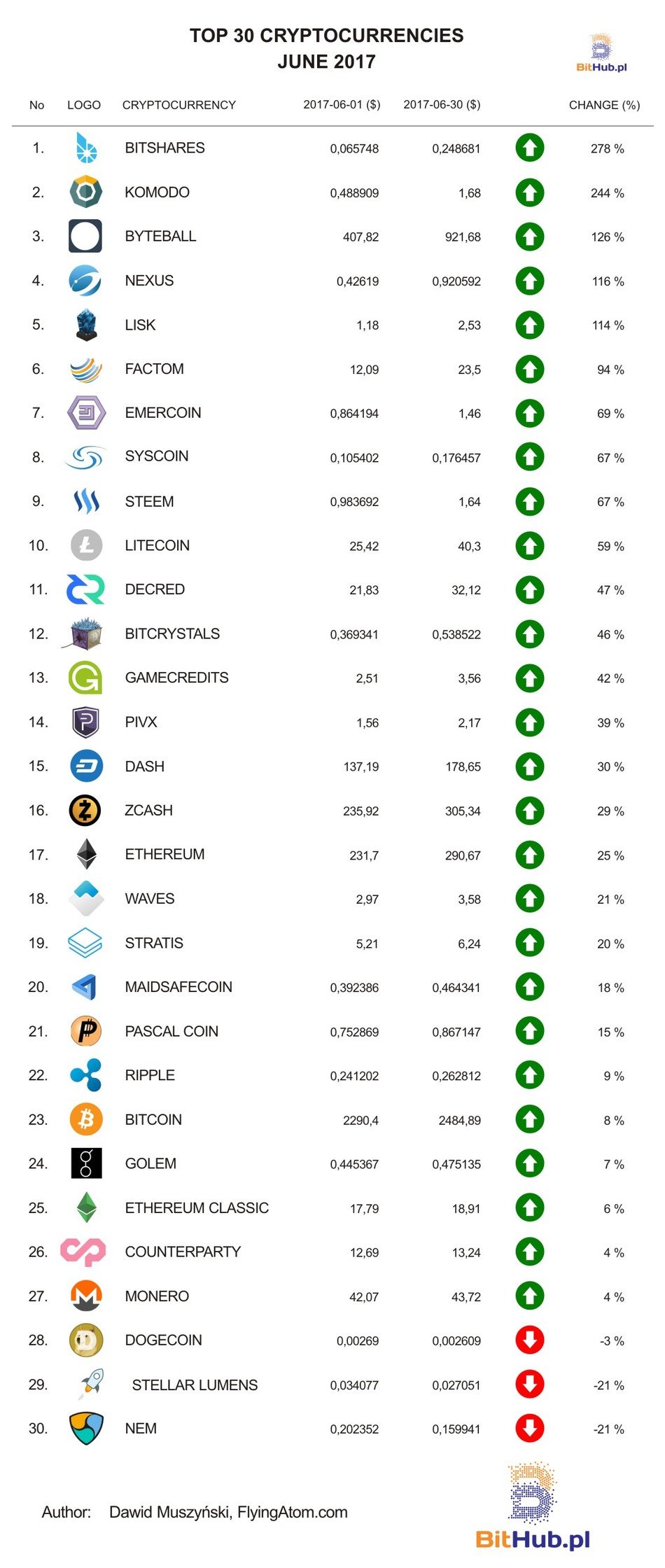 June`s three best cryptocurrencies are as presented: the leader was Bitshares which gave 279% return rate. The second place belongs to Komodo which grew about 244%. The third was Byteball with 126% result. The leader of April and May – Stratis – gave in June “only” 20% return rate.