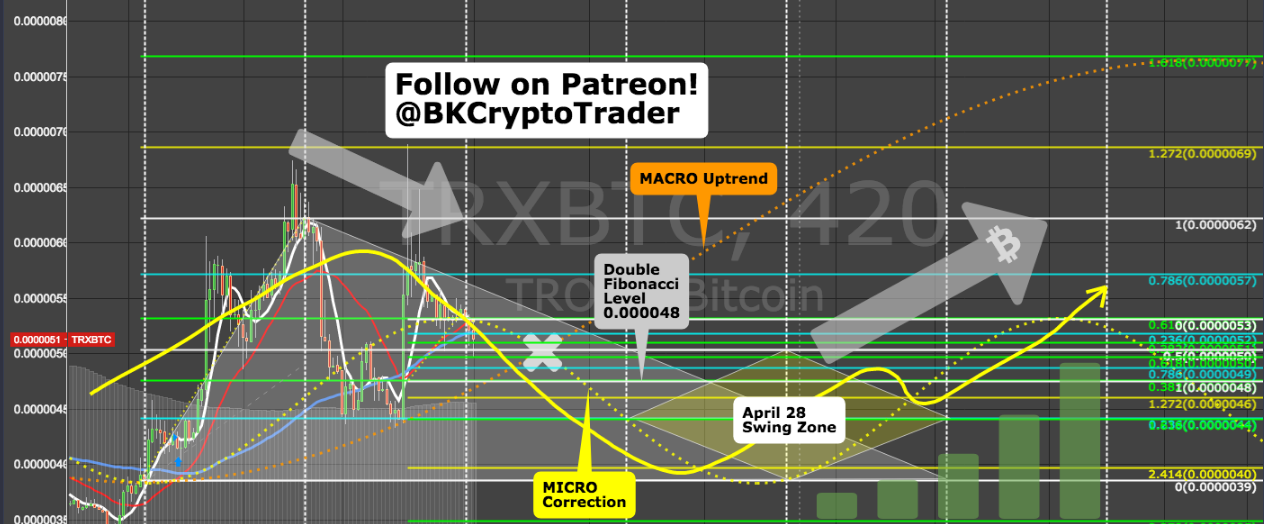 We have a double fibonacci level confirmed on both the macro uptrend & micro corrective cycle - so look for major price action around that line (0.000048 BTC)