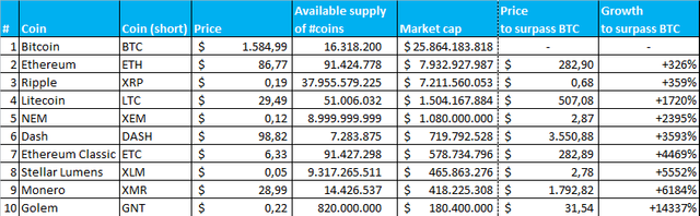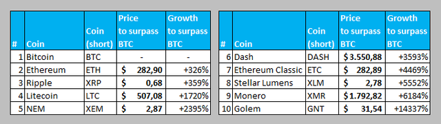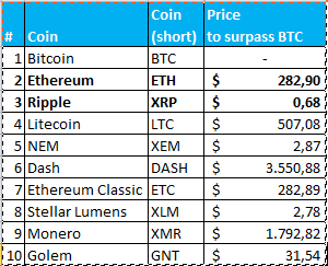 "Which price does my favorite altcoin need to reach in order to surpass Bitcoin (in terms of market capitalization)"