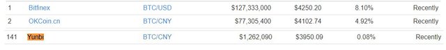 A look at Coinmarketcap shows that BTC is trading at a lower price than competitors such as OKcoin. Currently Yunbi is trading at $3950 USD per bitcoin whilst OKcoin is trading at $4102. This might be sign that OKcoin users are more concerned and choosing to sell their Bitcoin. It is important to note that the current trade volume for Yunbi is only at 1.2 Million USD, which is ranked #141 in terms of trade volume.