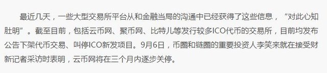 After reporting the demise of cryptocurrency exchanges in China, Chinese financial paper CaiXin followed up a rumor that exchange YunBi will close within 3 months. Journalists from CaiXin interviewed Xiaolai Li (李笑来) who indicated that YunBi will Progressively shut down in 3 months (There are no other official sources to back this up, other than the Caixin Journalist). Xiaolai Li is known to be a major investor in YunBi and is known to have investments in the ICO platform, ICOINFO. It is important to note that YunBi is the only large exchange talking about a potential shut-down, other exchanges such as BTCC, Huobi, OKCoin, Btc38 and Viabtc have all come out to say they haven't received any notices from the government.