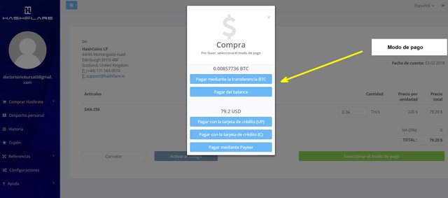 Marcamos el boton que dice (más adelante) si lo tienes es el idioma castellano... y luego te dira seleccione el modo de pago, marcas ese link y te dara las formas de pagar.... puede ser con saldo de la propia mineria o con btc de tu wallet externa o con tarjeta de crédito.