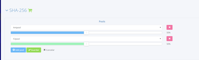 Esta página te permite también escoger con cual pool de minado quieres operar y con cuanto porcentaje, para mejor rendiento, tal como lo puedes observar en la imagen de abajo.