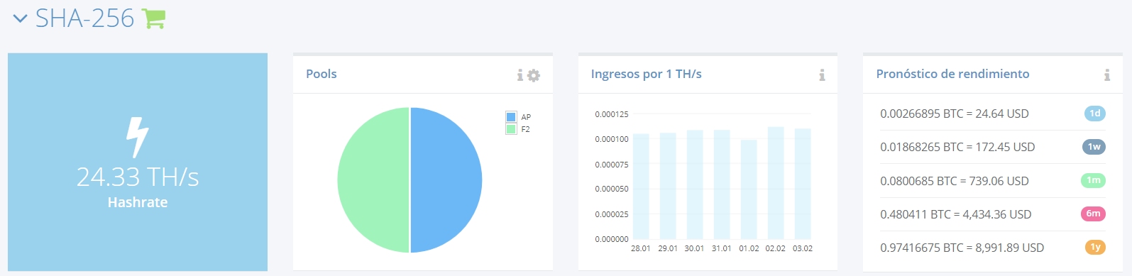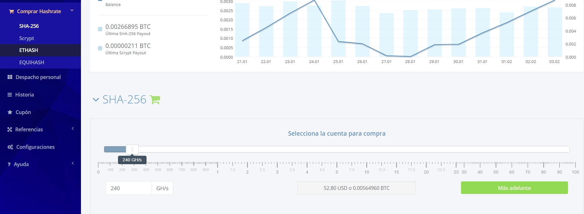 Una vez comprado esperar que se confirme la transferencia y proximamente veras el poder de minado comprado, además al dia siguiente de compra podrás ver los pronósticos de ganancias estimadas que te da la pagina.