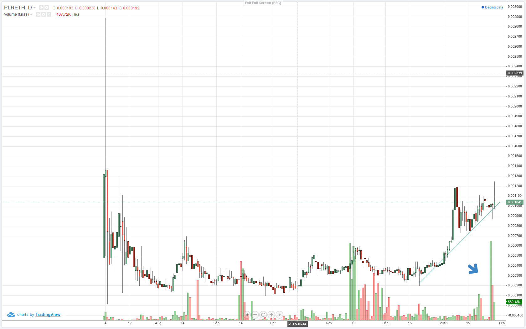 Pillar (PLR) vs ETH showing high volume uptrend.
