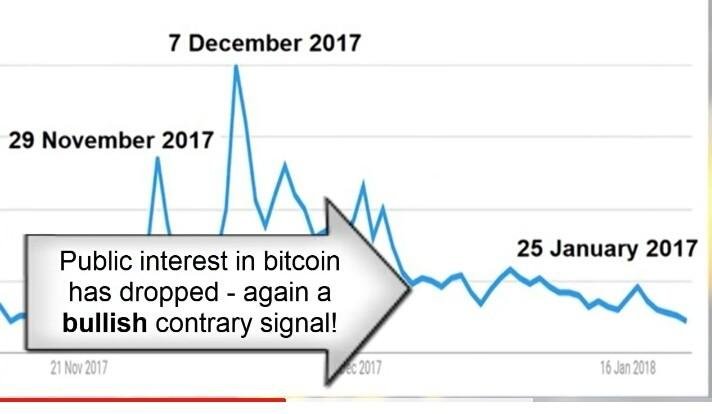 The graphic above shows the public's buying interest of bitcoin according to Google trends. You can clearly see that sentiment is once again at the lows and does suggest it will pickup in the coming weeks.