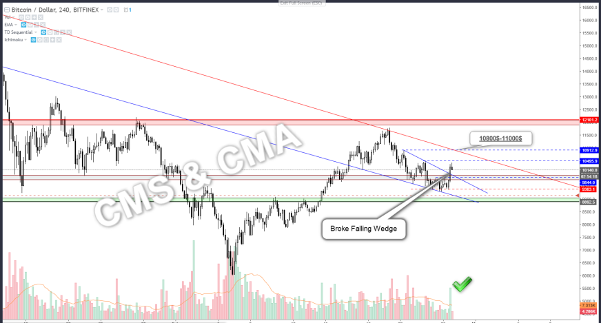 - Bulls take charge but there is weak resistance around 10450$ expect pull back to 10100$-10k (Re-ntry area) so far today D1 candle will close above 10k good for bull continuation: