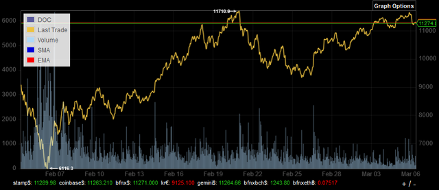 The overall move in the last month is still up from the low of $6116 on 6 Feb. We are in consolidation now at $11270. Will we see another breakout to the top today? We have seen 4 upward moves since 6 Feb, but it is looking smaller and smaller.
