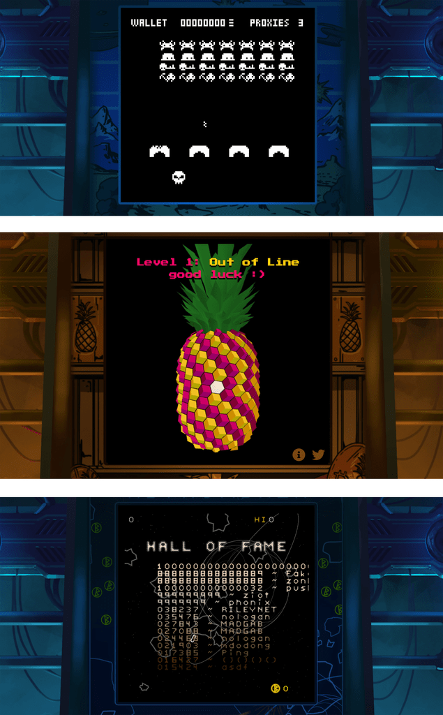 Pineapple Arcade is a beautifully designed maze of cues, clues, and retro games that lead to stockpiles of hidden cryptocurrency. When you first land inside the arcade you're greeted by a colorful 1980's punk interior. Arcades line two levels with interactive nooks scattered throughout this gamers paradise. Click to zoom in, click again to play. There's literally tens of thousands of dollars in digital currencies here, waiting to be uncovered.