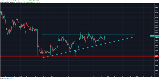 Trading of ETH/USD above $185 for 4-6 consecutive hours would confirm a breakout for ETH and a new floor for support @ $182.89 area.