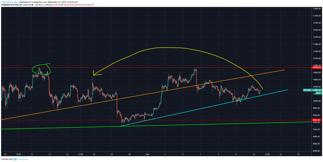 A breach downward of the (blue trendline) will most likely take us back to test the bottom part of the channel at $9,463 (red line).